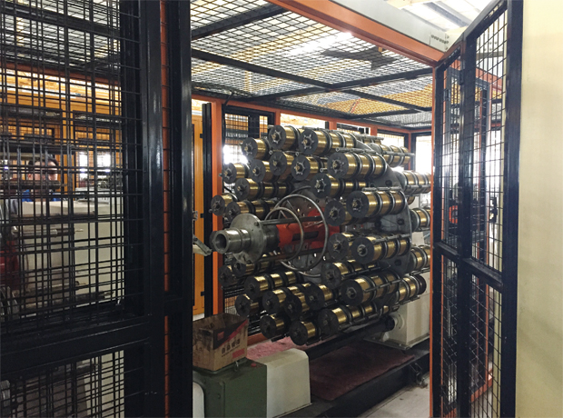 1.本機配備我公司設計的大容量滾動(dòng)線(xiàn)軸和漲力補償器(我公司產(chǎn)品),實(shí)現了每根鋼絲單獨控制漲力和機下預先調整保障了每根鋼絲放線(xiàn)漲力一致,解決了大線(xiàn)軸與小線(xiàn)軸的漲力差,克服了纏繞旋轉離心力,提高了纏繞質(zhì)量,降低了鋼絲的浪費,提高了工作效率50%以上。采用每盤(pán)行